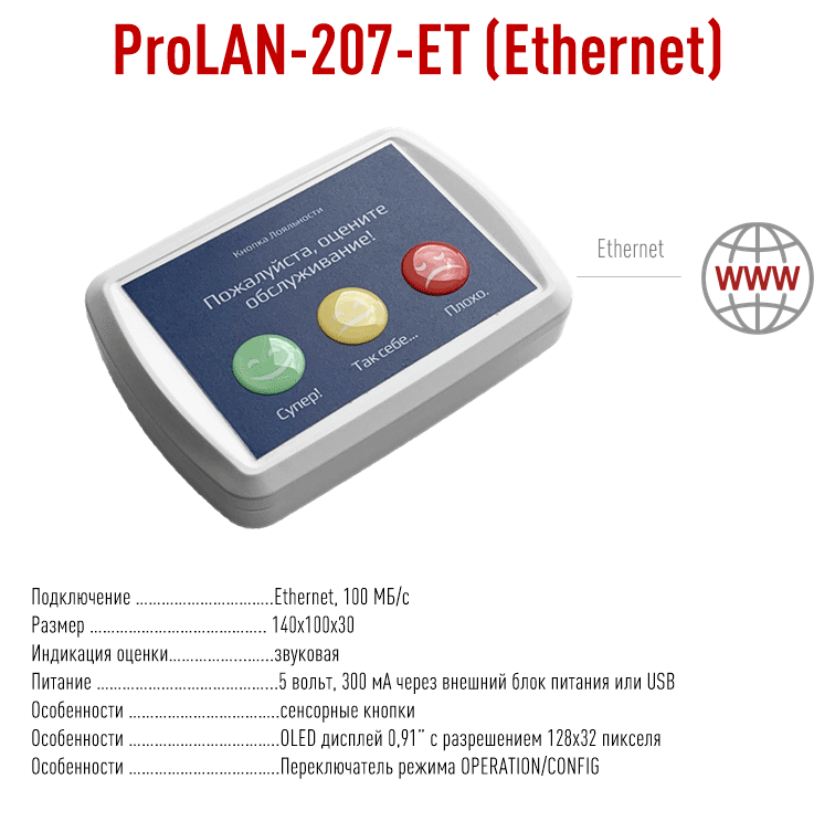 Пульт ProLAN-207 может быть «прошит» на передачу данных не в облачные сервисы (Loyalty Reporter, CXM-Online), а на компьютер локальной сети, работающий под управлением MS Windows, на котором выполняется программа EPM Agent Plus. Это расширяет возможности решения, «превращая» Кнопку Лояльности ЛАЙТ в Кнопку Лояльности СТАРТ. Стоимость пульта ProLAN-207 от «прошивки» не зависит.