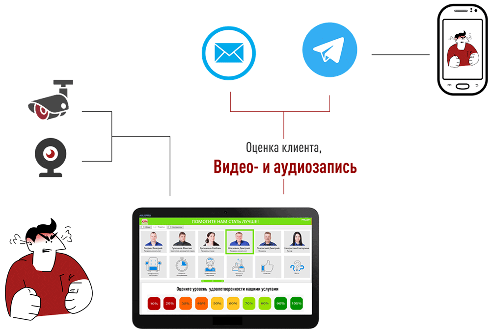 - Возможность автоматически записывать и отправлять в Telegram и на электронную почту видео – и аудиозапись контакта с клиентом. Запись выполняется в течение определенного времени после того как клиент кликнул на определенную оценку. Для записи может использоваться любая IP или WEB камера, в том числе внешняя камера, используемая для других целей. Предотвращает «накрутку» оценок заинтересованным персоналом.