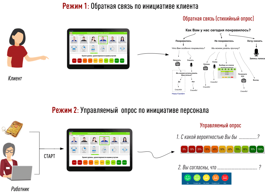 - Режим 1: Обратная связь (стихийный опрос) по инициативе клиента. Позволяет «услышать» клиентов, которые хотят быть услышанными.