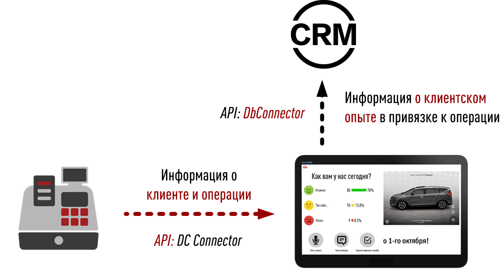 Сенсорный Фронт Мотиватор может интегрироваться с приложением передней линии (например, кассовой системой) и с CRM. Для интеграции с приложением передней линии используется API: DC Connector. Для интеграции с СRM - API: DbConnector.