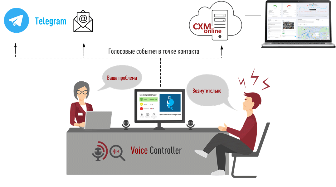 Программа Voice Controller позволяет автоматически фиксировать в точках контакта определенные голосовые события, например, конфликтные ситуации и возражения клиентов ("возмутительно", "пригласите менеджера", "дорого" и т.п.) и автоматически отправлять их в сервис CXM-Online и т.п. и/или группу Telegram. Подробнее см. Бесконтактный Датчик Инцидентов.