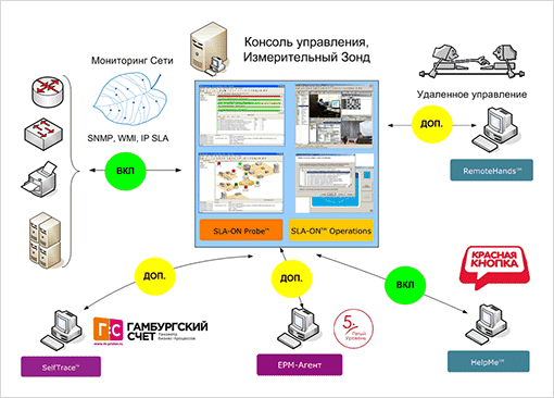 Автоматическое измерение времени реакции бизнес-приложений (response time) и диагностика возникающих у пользователей ошибок (Application Performance Management, APM) Оценка качества работы бизнес-приложений «глазами пользователей» (Quality of Experience, QoE) |
