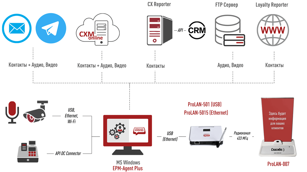 В качестве маршрутизатора аудио- и/или видеозаписей используется приложение EPM-Agent Plus. Получатель выбирается автоматически на основе тега, присвоенного при сепарации контактов. Получателями аудио- и/или видеозаписей могут быть: FTP-сервер, чат или группа Telegram, определенные ящики электронной почты, сервис CXM-Online.