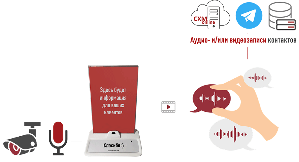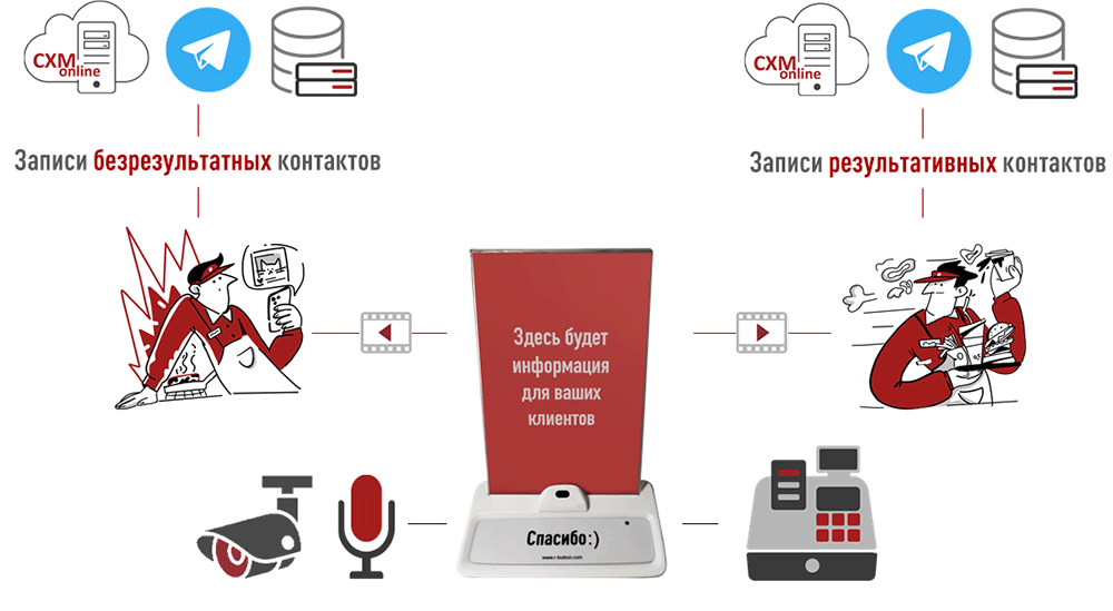 - Аудио- и/или видеорегистратор с управляемой записью, автоматически «нарезающий» аудио- и видеозаписи процесса обслуживания клиентов на отдельные контакты, начинающиеся в момент прихода клиента в точку контакта и заканчивающиеся уходом клиента из точки контакта;