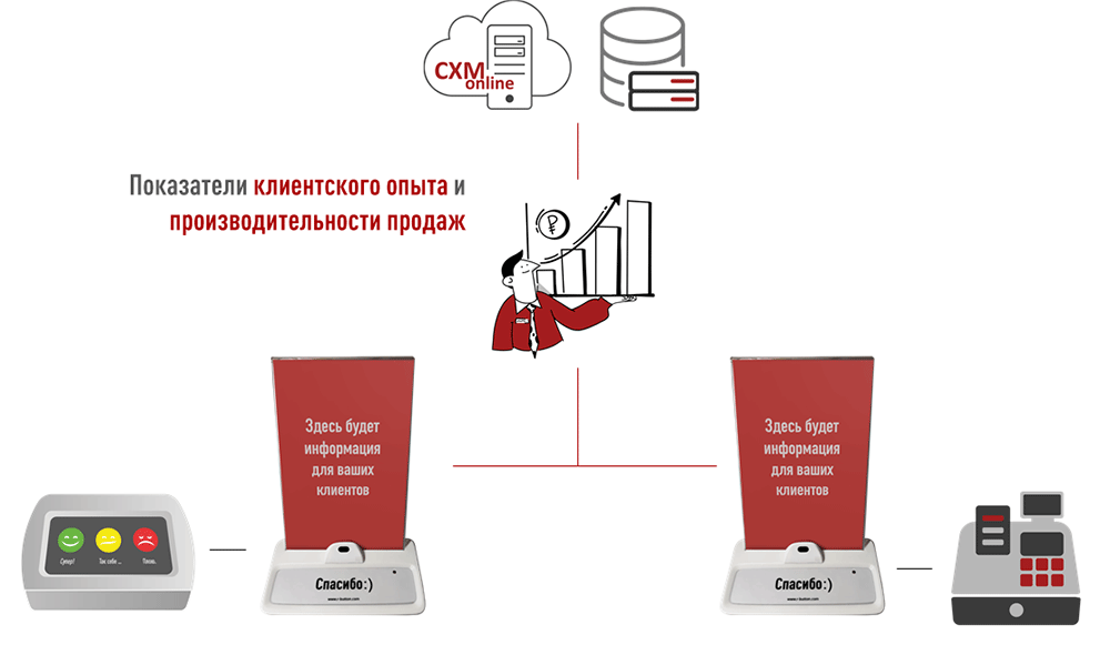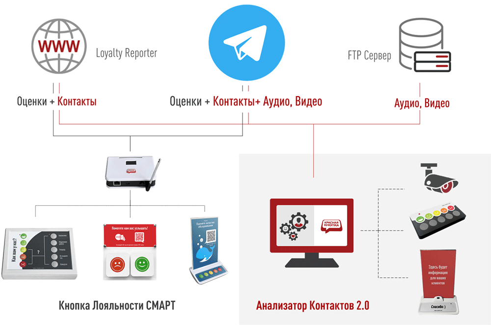 - Экономичное управление клиентским опытом. В этом случае в критически точках контакта устанавливается АК 2.0 в комплектации СТАРТ №2. А в менее важных точках контакта - Кнопка Лояльности СМАРТ. Архитектура такого решения показана на рисунке ниже.