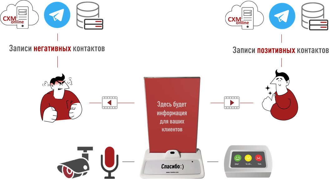 Использование АК 2.0 вместе с Кнопкой Лояльности позволяет автоматически разделять (сепарировать) аудио- и видеозаписи контактов в зависимости от полученной оценки качества обслуживания. Например, на позитивные контакты, когда клиенты оценили услугу положительно (нажали зеленую кнопку), и негативные контакты, когда клиенты оценили услугу отрицательно (нажали красную кнопку).