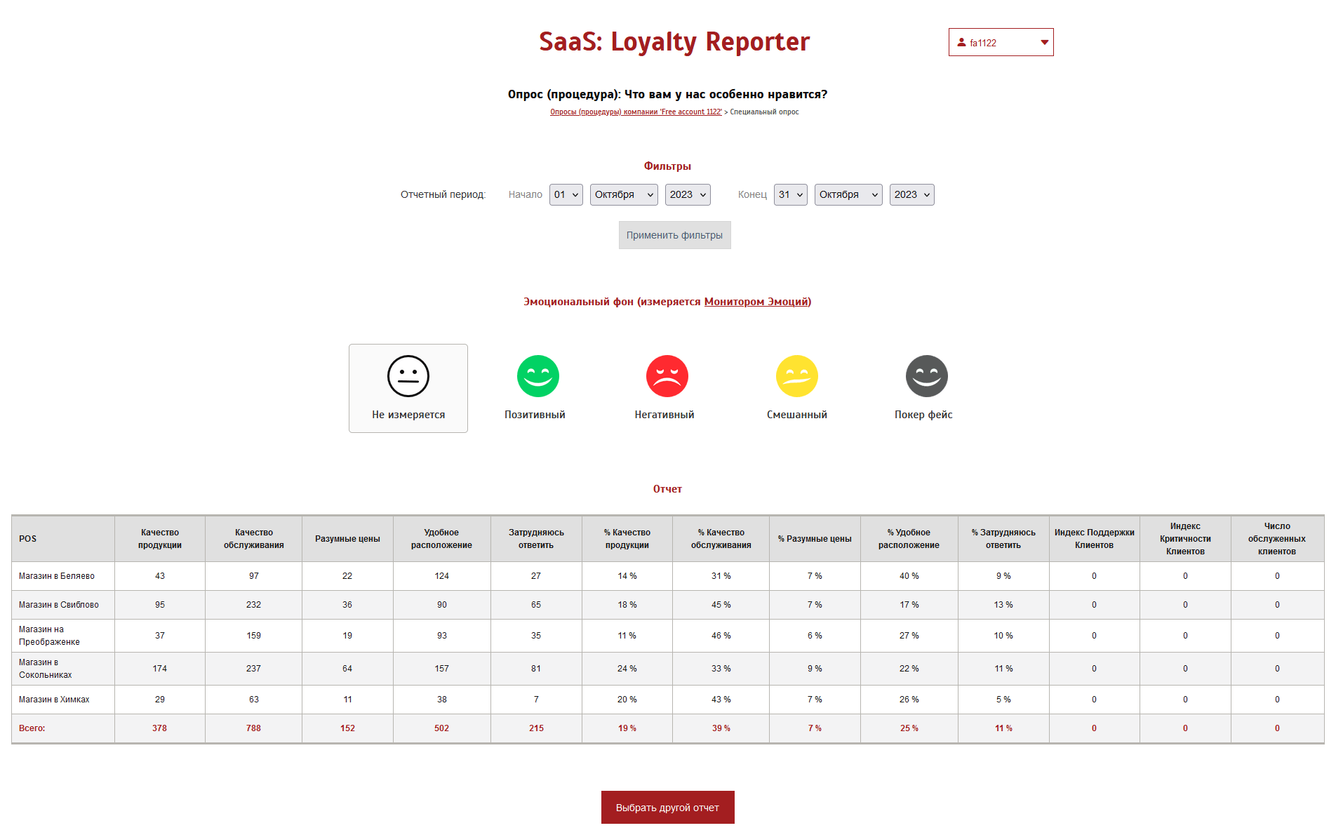 Результатом услуги Экспресс-Анкетёр является набор отчетов в личном кабинете сервиса Loyalty Reporter, содержащих статистику ответов на задаваемые клиентам вопросы. Статистика может представляться в разных разрезах (по сотрудникам, точкам продаж и т.п.) и за разные периоды времени.