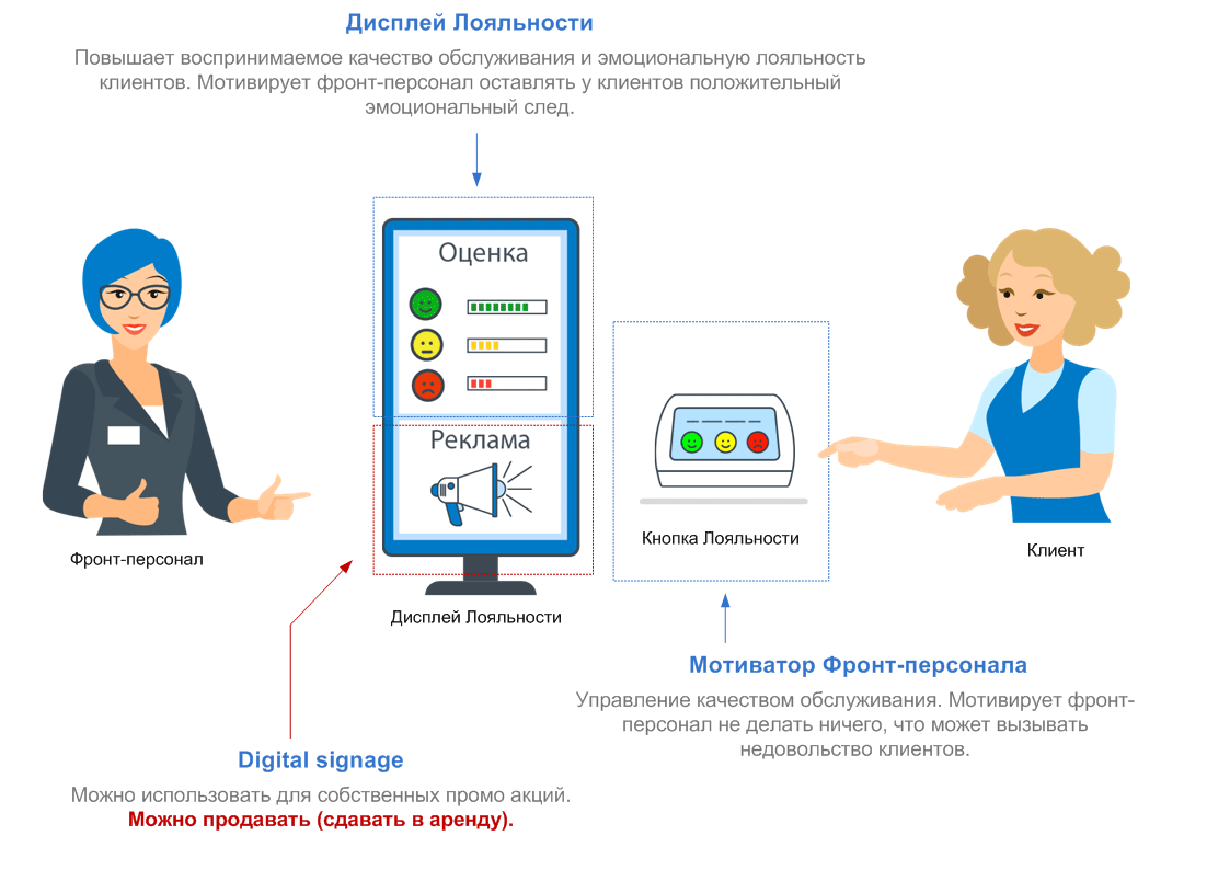 - На кассе устанавливаем пульт (Кнопку Лояльности) и Дисплей Лояльности с фотографиями продавцов, с помощью которых покупатели оценивают воспринимаемое качество консультаций.