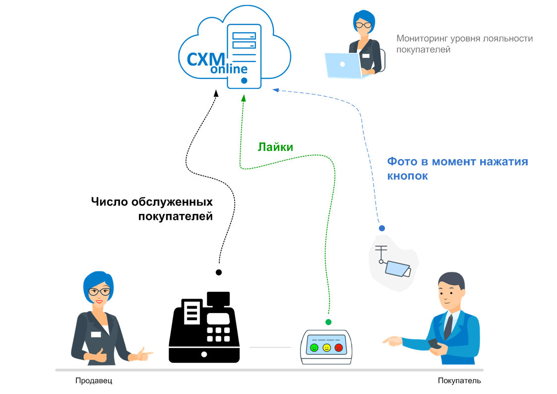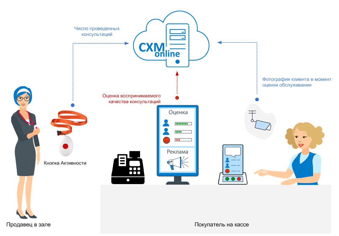 - Автоматически передаем всю получаемую информацию в облачный сервис CXM-online, по определенной технологии измеряем Вовлеченность Продавцов и определяем "узкие места" процесса продаж в зале.