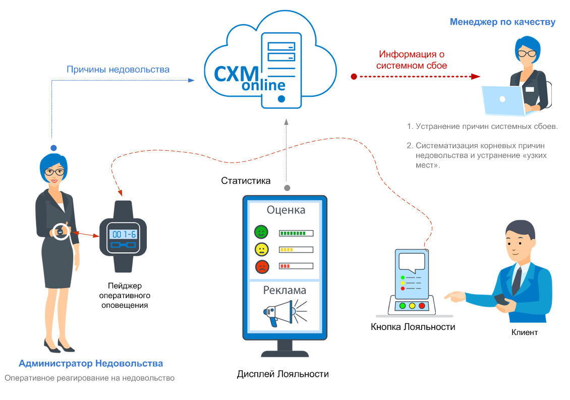 - Из числа фронт-персонала назначаем Администратора Недовольства, которому даем Пейджер оперативного оповещения и настраиваем Кнопку Лояльности на автоматическую передачу на Пейджер сигналов о нажатии покупателями красной кнопки (красных нажатиях).