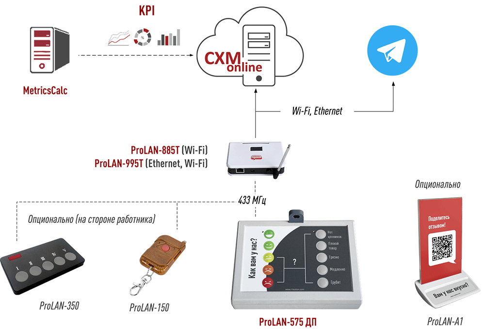 | 6. | ОПЦИОНАЛЬНО. Любой беспроводной пульт или кнопка, работающие на частоте 433 МГц., например, кнопка ProLAN-150. Дополнительные пульты и кнопки могут устанавливаться на стороне персонала и использоваться для управления конверсией и проведения репрезентативных опросов клиентов. |