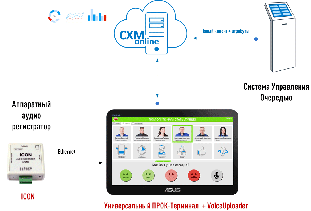 Универсальный ПРОК Терминал включает два решения = Объединенный Пост Качества + Терминал Обратной Связи и Сенсор Анкетер.