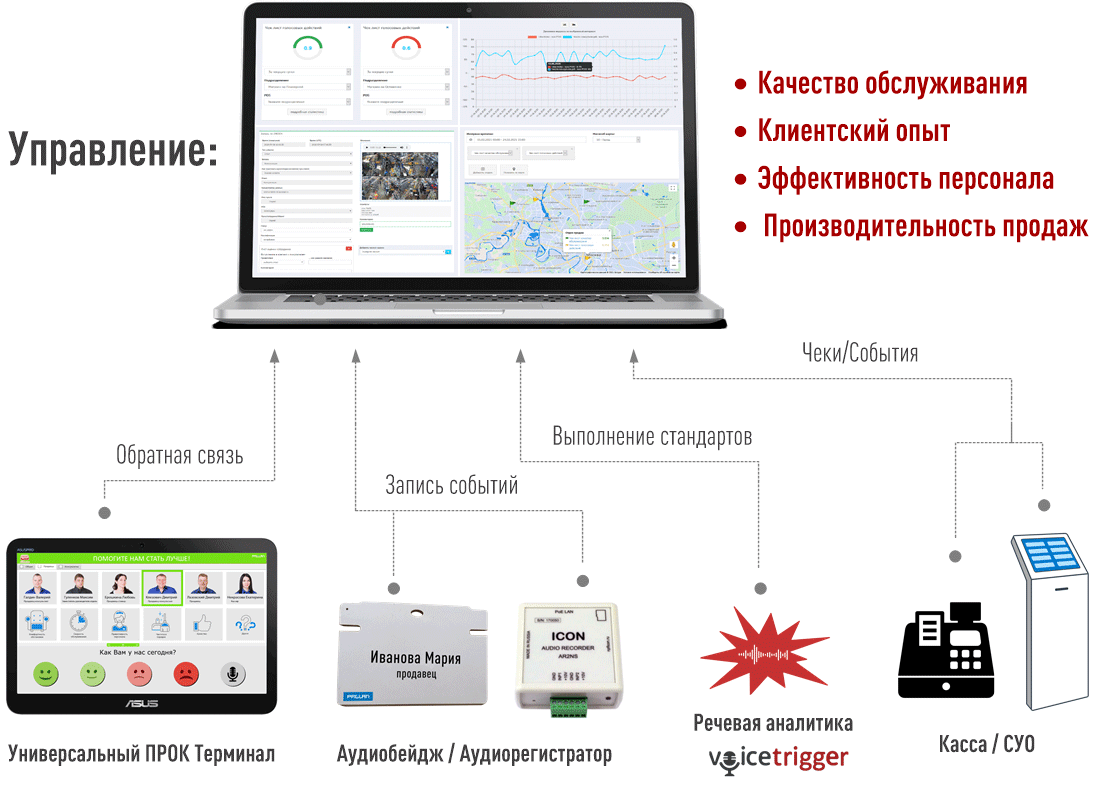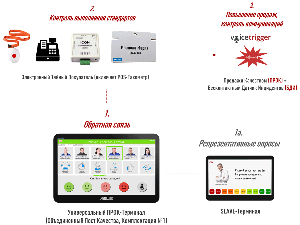 Бесконтактный Датчик Инцидентов (БДИ) + Продажи Качеством (ПРОК): Контроль коммуникаций между клиентами и фронт персоналом в реальном времени + повышение конверсии и глубины чека. Инновационное решение на основе речевой аналитики VoiceTrigger, используемое для эффективного управления инцидентами (Бесконтактный Датчик Инцидентов) и повышения конверсии и среднего чека (Продажи Качеством). Ключевое отличие от Электронного Тайного Покупателя – отсутствие необходимости прослушивать записи разговоров клиентов с фронт персоналом.