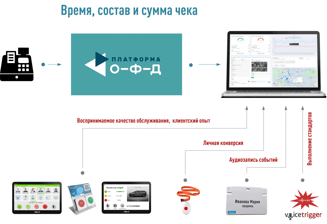 Все модели Менеджера Качества прозрачно интегрируются с Платформой О-Ф-Д. Для интеграции используется Windows-приложение OFD Replicator. Приложение устанавливается в локальной сети клиента (магазина). Используя API ОФД, приложение «от имени клиента» импортирует информацию о времени, составе и сумме чеков. Получаемая информация в обработанном виде передается Менеджеру Качества, где объединяется с информацией о воспринимаемом качестве обслуживания, клиентском опыте, выполнении продавцами стандарта обслуживания и т.п.