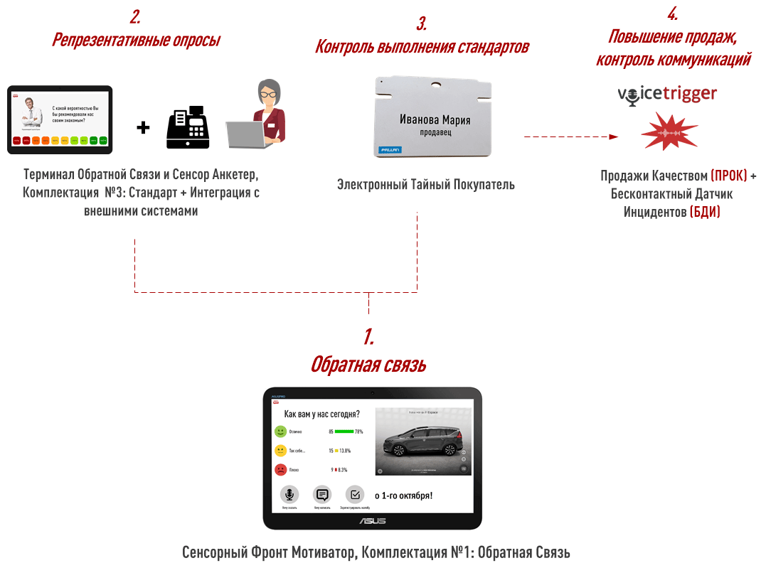 Профессиональное решение, позволяющее эффективно получать от клиентов обратную связь в точке контакта. Клиент ориентированная книга отзывов и предложений. Функциональные возможности решения см. Сенсорный Фронт Мотиватор, Комплектация №1: Обратная Связь