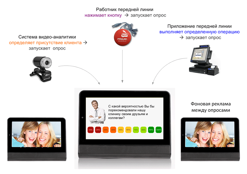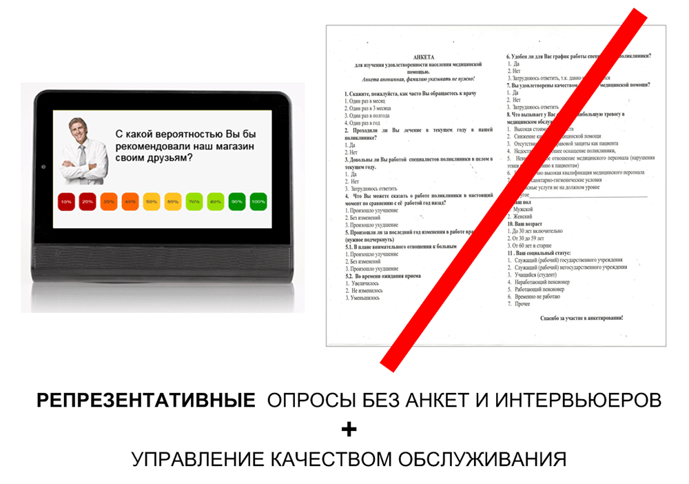 В процесс обслуживания клиентов встраиваются управляемые опросы. Каждому клиенту может задаваться как серия вопросов, так и только один вопрос, случайным образом выбираемый из определенного списка. Результаты объединяются, и статистически обрабатываются. Если в опросах принимает участие большинство клиентов (основной массив), то это позволяет проводить полноценные маркетинговые исследования даже в тех случаях, когда клиенту нельзя задавать более одного вопроса. Например, на кассе магазина.
