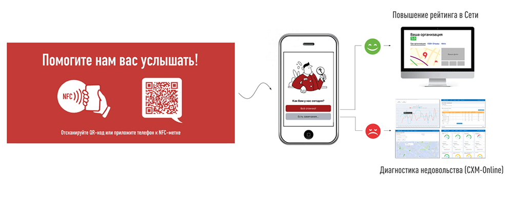 QR-Промоутер – экономичный профессиональный продукт для управления репутацией и качеством клиентского сервиса, в котором для получения данных используются QR-коды и NFC-метки, а для организации процесса опроса, аналитики и представления данных - сервис CXM-Online.