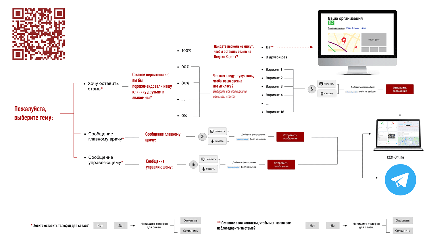 Клиентский позитив направляйте на Яндекс Карты и т.п. и повышайте репутацию своей организации. Клиентский негатив автоматически пересылайте в службу качества, систематизируйте причины недовольства клиентов и устраняйте имеющиеся «узкие места».