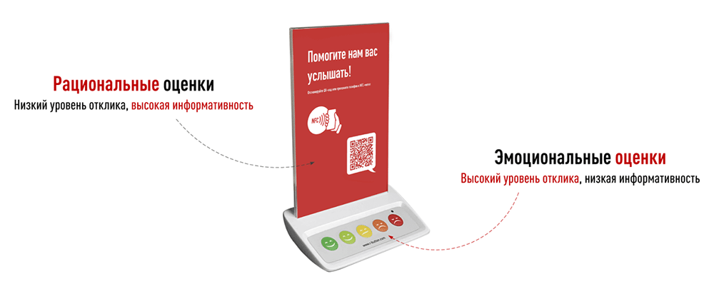 QR-Промоутер и Кнопка Лояльности дополняют друг друга. Кнопка Лояльности – это эмоциональные оценки с относительно высоким уровнем отклика, но низкой информативностью. QR-Промоутер – это рациональные оценки с низким уровнем отклика, но высокой информативностью.