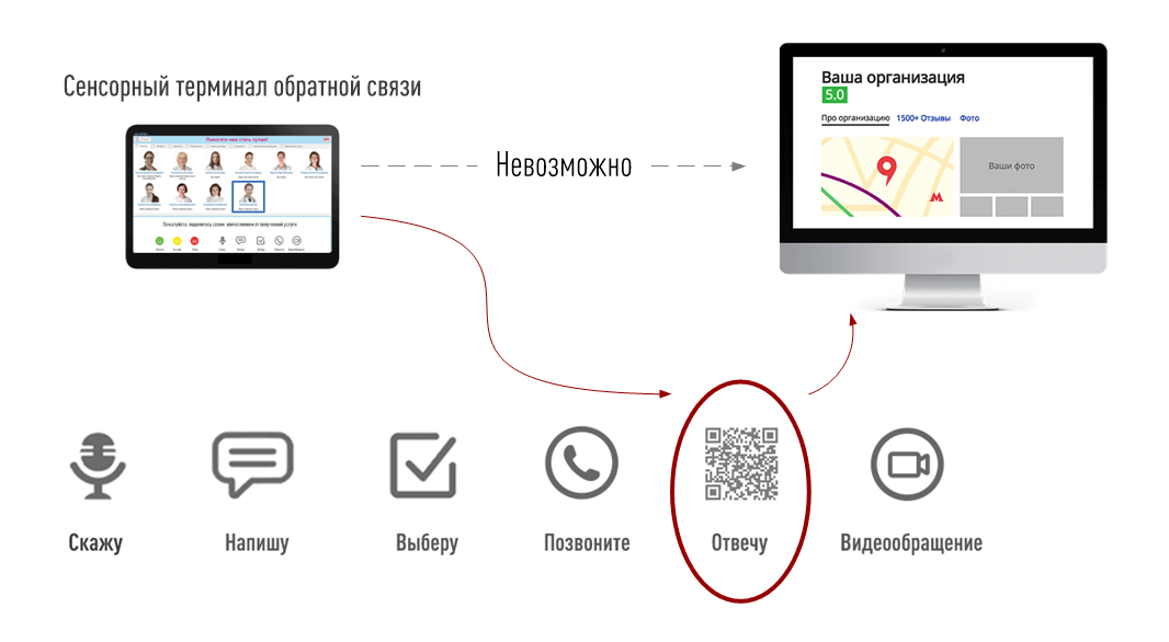 QR-Промоутер в составе сенсорного терминала обратной связи, например, Объединенного Поста Качества позволяет довольным клиентам, не отходя от терминала, оставлять положительные отзывы на Яндекс Картах, 2 GIS и других площадках.