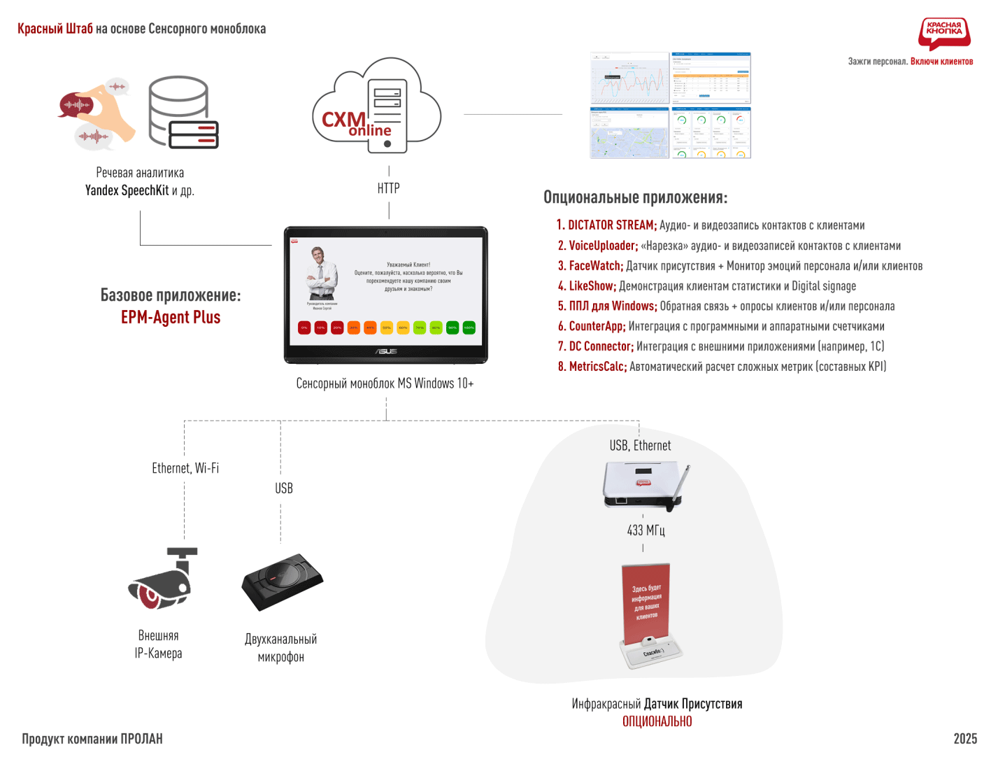 - Красный Штаб №1 - ориентирован на точки быстрого обслуживания, в которых коммуникации продавцов (менеджеров) и покупателей (клиентов) происходят преимущественно в одной точке и занимают относительно короткое время (не более нескольких минут). Красный Штаб №1 - оптимальное решение для ресторана быстрого питания, специализированного магазина с прилавком, кофейни, АЗС, регистратуры клиники и т.п.