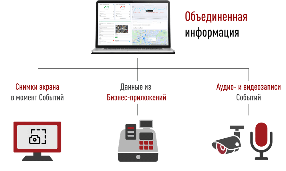 Объединение информации, получаемой из различных источников, и представление её в удобном для анализа и управления виде. Например, объединение аудио- и видеозаписи процесса коммуникации с клиентом, информации, импортируемой из приложения передней линии (например, фирмы 1С), снимка экрана с компьютера фронт персонала в момент события (например, пробития чека).