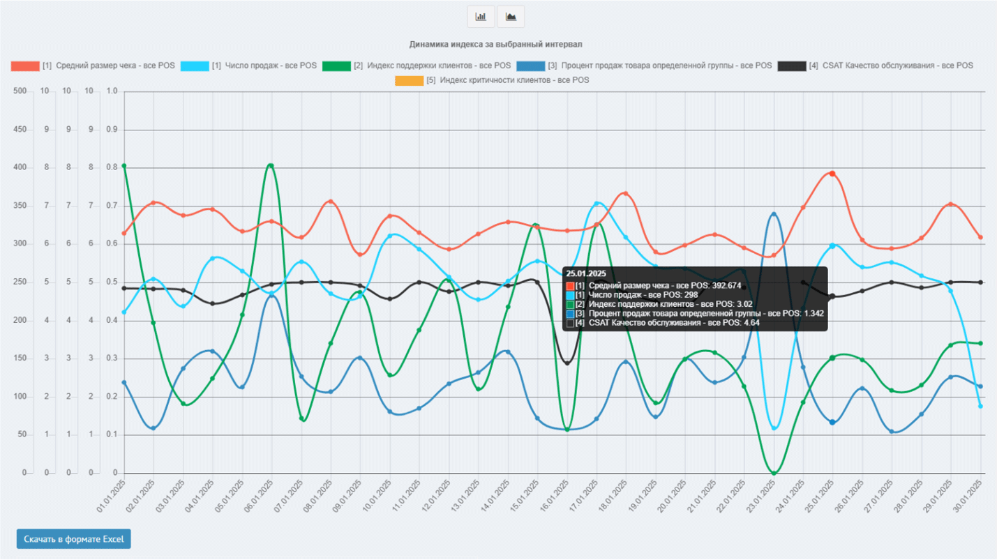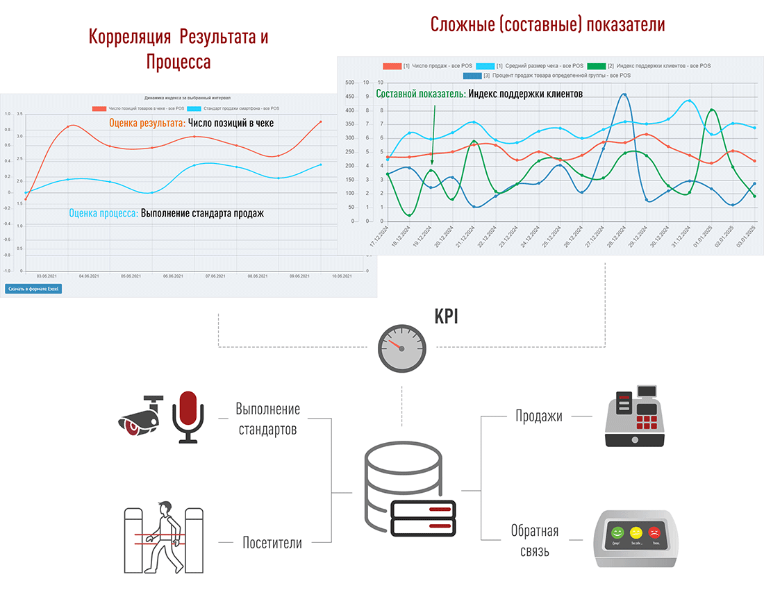 Удобный для анализа и управления вид, в данном случае, это автоматическое масштабирование и «привязка» всех показателей к единой временной шкале, что позволяет оценивать корреляцию между Результатом, например, Конверсией продаж, Средним чеком и т.п. и Процессом, например, Выполнением продавцами стандарта обслуживания. Возможность оценивать корреляцию между Результатом и Процессом кардинально повышает эффективность управления эмоциональной лояльностью клиентов и производительностью продаж.