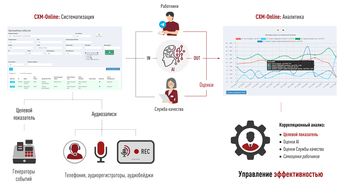Уникальная архитектура SenseTracker позволяет синхронизировать управление эффективностью как онлайн- (телефонные продажи), так и офлайн-каналов (розничные точки), обеспечивая сквозную аналитику и согласованность бизнес-процессов.