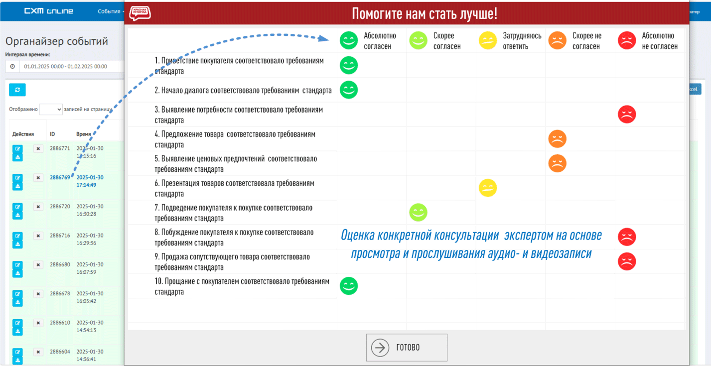Вы получите возможность оценивать любые события, в частности, консультации покупателей. Для оценки сможете использовать как Чек листы, так и Речевую аналитику, например, сервис Yandex SpeechKit и др.