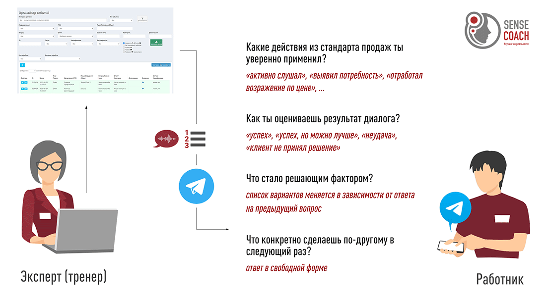 - SenseCoach отвечает на вопрос: «КАК сделать так, чтобы каждый сотрудник стабильно делал именно то, что нужно?». Ответ через коучинг и контроль качества.