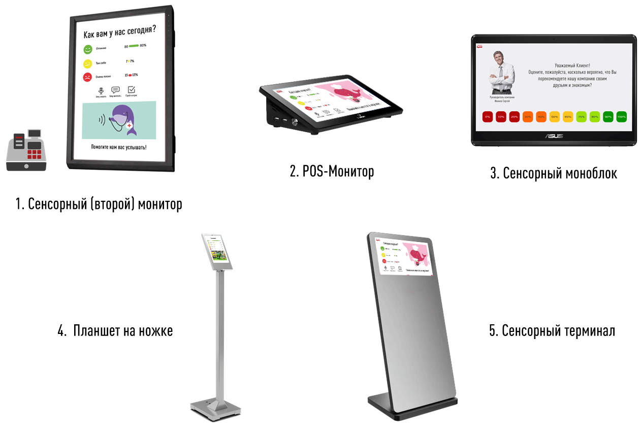 Уникальное преимущество - поддержка POS-терминалов со вторым сенсорным монитором. Это идеальное решение для точек продаж: касса продолжает работать в обычном режиме, а на втором экране собирается обратная связь.