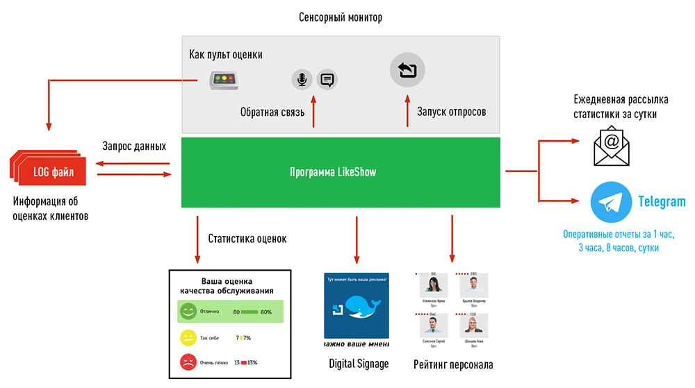 При размещении окна программы на сенсорном мониторе вы можете получить дополнительный пульт оценки качества обслуживания. Включите в настройках программы режим поддержки интерактивности и клиенты смогут давать оценки нажатием на соответствующий значок или текст оценки на экране.
