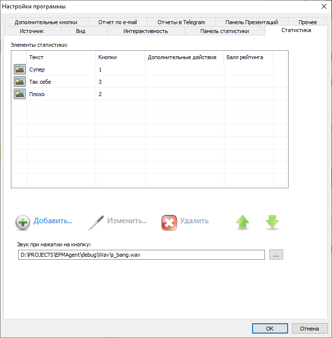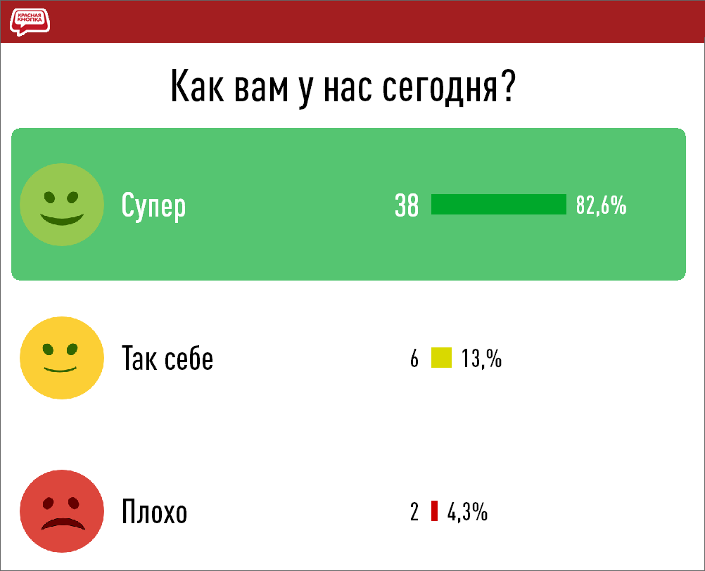 Выполняя запросы к LOG файлу с заданной частотой, программа получает сигнал нажатия клиентом кнопки оценка качества обслуживания. При достаточно высокой частоте запросов, например раз в полсекунды, сигнал поступает практически в реальном времени. Программа запрашивает из LOG файла только новые, еще не полученные данные. Определив наличие в LOG файле новой оценки, программа суммирует ее с ранее полученными, вычисляет процентное распределение оценок и отображает результаты на экрана в области панели статистики.