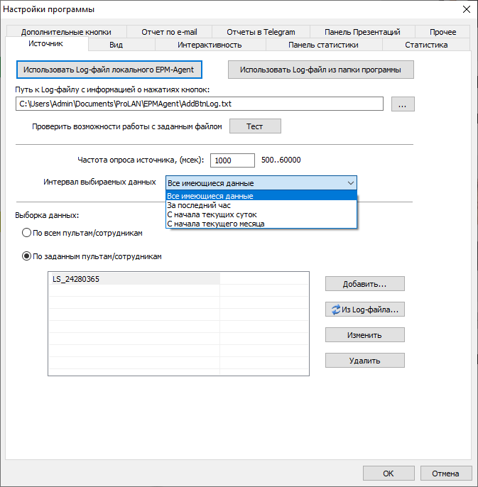 LOG файл с оценками качества обслуживания формируется программой EPM-Agent Plus. Файл может размещаться как на жестком файле диска локального компьютера, так и в папке файлового сервера локальной/виртуальной частной сети. При этом запись в LOG файл может производиться как с одного компьютера с программой EPM-Agent Plus, так и с нескольких компьютеров. И наоборот, данные из одного и того же LOG файла могут использоваться программами LikeShow установленными на разных компьютерах сети. В настройках программы LikeShow просто указывается папка, в которой находится LOG файл.