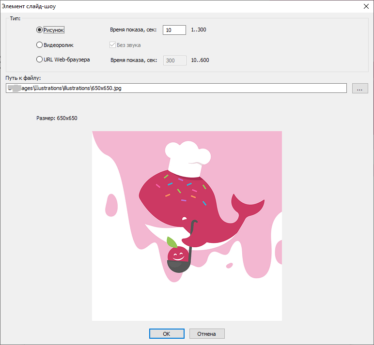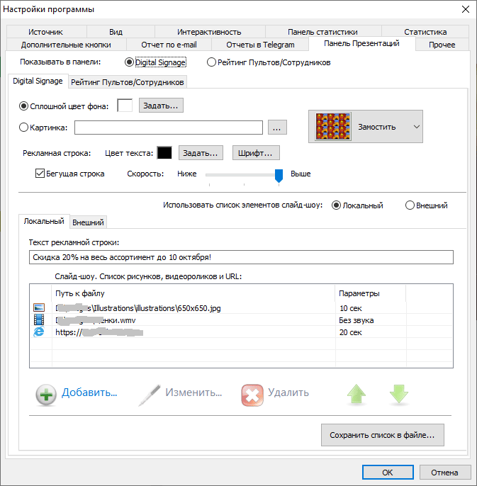 В режиме Digital Signage в Панели Презентаций показывается набор рекламных и информационных элементов – Слайд шоу и, опционально, бегущая рекламная строка. Список элементов Слайд-шоу настраивается и может храниться как на локальном компьютере, так и в папке файлового сервера. В последнем случае единым списком могут пользоваться сразу несколько компьютеров сети с программой LikeShow. Изменения в составе списка элементов автоматически подхватываются всеми компьютерами.