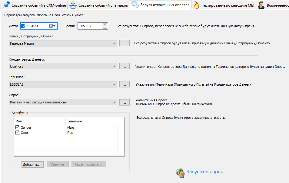 Перед запуском Опроса в диалоге задается дата и время, которое будет присутствовать в результатах, передаваемых в сервис, а также Пульт/Сотрудник к которому нужно привязать результаты Опроса.