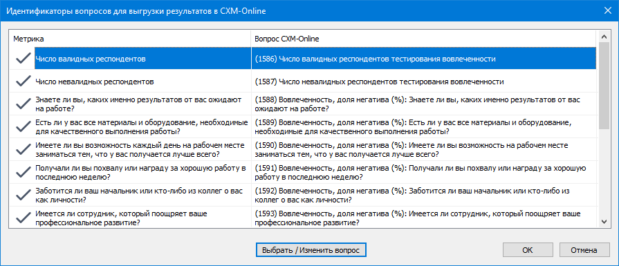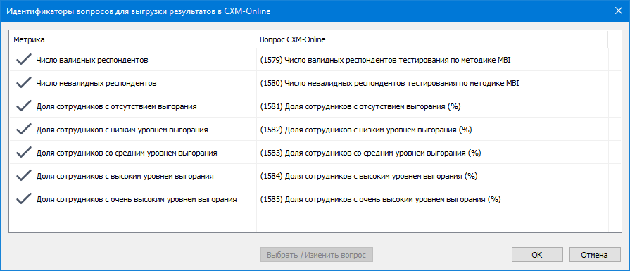 Также, один раз необходимо связать результирующие показатели с идентификаторами результирующих вопросов в сервисе.