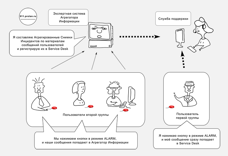 Режим ALARM вызывается долгим (около 2 секунд) нажатием «красной кнопки». Для первой группы пользователей действие его сходно с действием Нормального режима. По нажатии «красной кнопки», как и в Нормальном режиме, Снимок Инцидента регистрируется в Service Desk, только происходит это сразу, без открытия диалогового окна. Поскольку информации в таком Снимке Инцидента может быть недостаточно для понимания того, что именно произошло у пользователя (т.к. пользователь не указывает «что случилось»), сотрудник службы поддержки, получив урезанный Снимок Инцидента, при необходимости звонит пользователю и уточняет детали по телефону или другим способом связи.