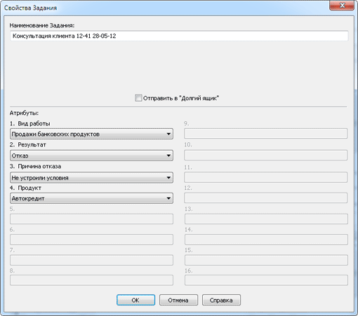 Чтобы получить такую информацию, Консультант делает следующее. В главном окне программы SelfTrace выбирает Задание-Транзакцию (которое было автоматически создано по нажатию «красной кнопки») и устанавливает у этого Задания нужные атрибуты. Чтобы указать, каким продуктом интересовался Клиент, Консультант устанавливает значение атрибута «продукт» (например, автокредит). Чтобы указать, что продажа не состоялась, он устанавливает значение атрибута «результат» (например, отказ). Чтобы указать, что именно не устроило Клиента, он устанавливает значение атрибута «причина отказа». Могут быть и другие атрибуты. Настройка атрибутов осуществляется из Справочника Атрибутов. Пример диалога установки атрибутов показан на Рисунке 6.