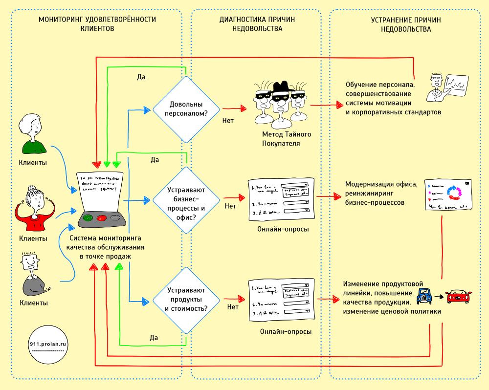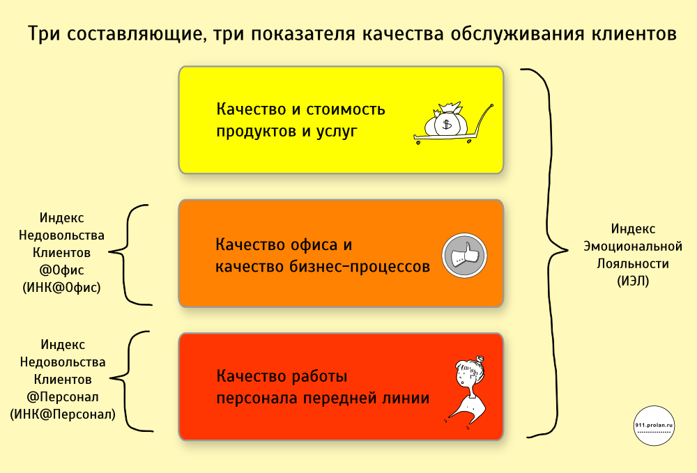 Чтобы определить, к какой из трёх групп причин относится выраженное клиентами недовольство, используется система оценки качества обслуживания клиентов Кнопка Лояльности и технология, описанная выше. Ключевые Показатели Качества Обслуживания (КПКО), которые для этого используются – ИНК@Персонал, ИНК@Офис, ИЭЛ (см. выше).