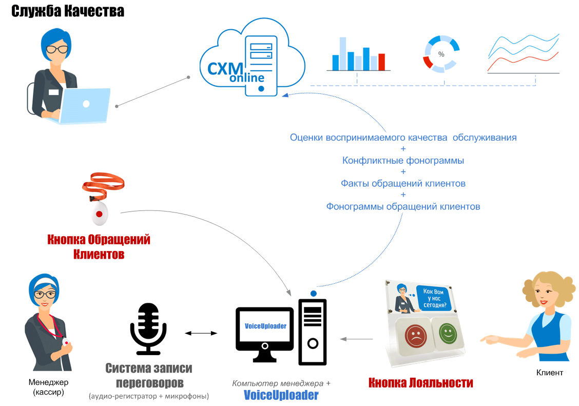 Все переговоры между клиентами и фронт-персоналом (кассирами) автоматически записываются на диктофон или передаются в Аудиорегистратор. Поддерживаемые системы записи переговоров.