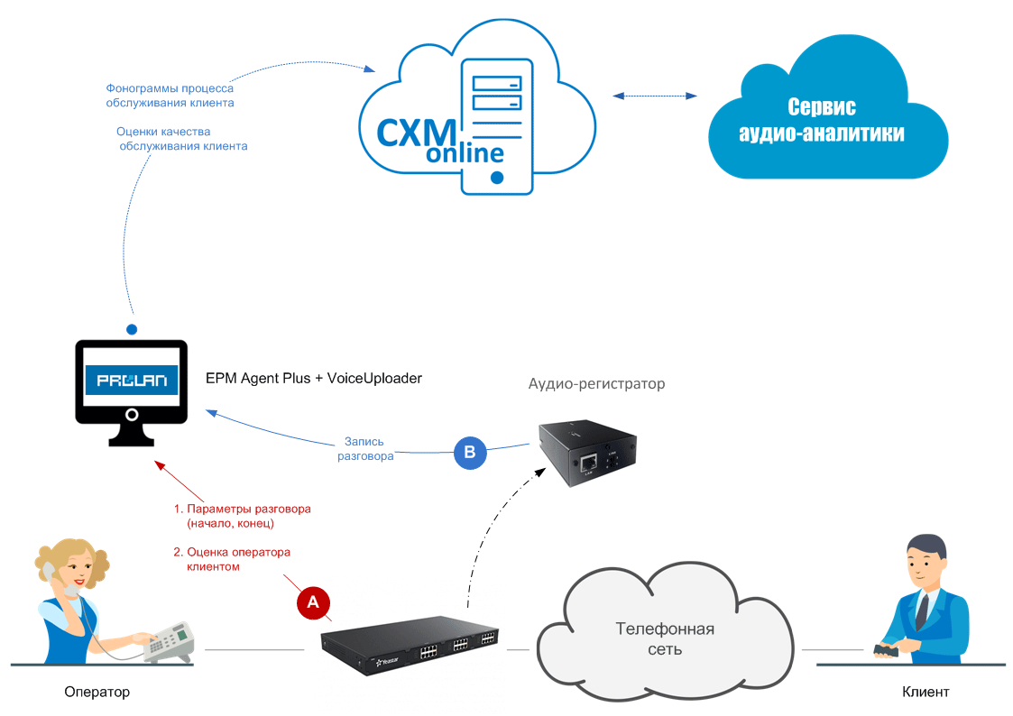 Автоматически передает все фонограммы в CXM-online.