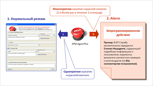 - для отправки сообщений типа: «Прошу срочно со мной связаться» (EPM-Agent Plus автоматически сформирует и отправит в службу технической поддержки Снимок Инцидента – информацию о пользователе, его окружении, что он делал в момент нажатия «красной кнопки» и другое.)