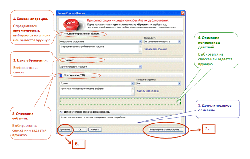 - Бизнес-операция (Что делаю/Проблемная область). В этой секции пользователю предлагается выбрать выполняемую бизнес-операцию или область, связанную с целью нажатия «красной кнопки». Выбор делается из списка «Что делаю/Проблемная область», автоматически загружаемого из Файла Конфигурации. Если критерий для данной операции был определён (в Файле Конфигурации), то наименование этой бизнес-операции выводится автоматически. Если критерий определён не был или этому критерию соответствует несколько бизнес-операций, то пользователю предлагается выбрать операцию или проблемную область вручную. Если в предложенном списке подходящего выбора нет, пользователь может добавить своё (новое) описание.