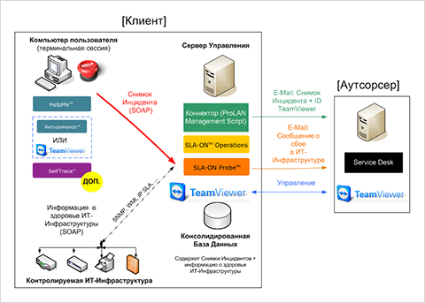 Получив электронной письмо, Аутсорсер автоматически получит информацию о том, кому нужна помощь, описание проблемы (опционально), скриншот компьютера пользователя, информацию о здоровье ИТ-Инфраструктуры в момент нажатия «красной кнопки», ID и пароль Team Viewer для доступа к Серверу Управления.