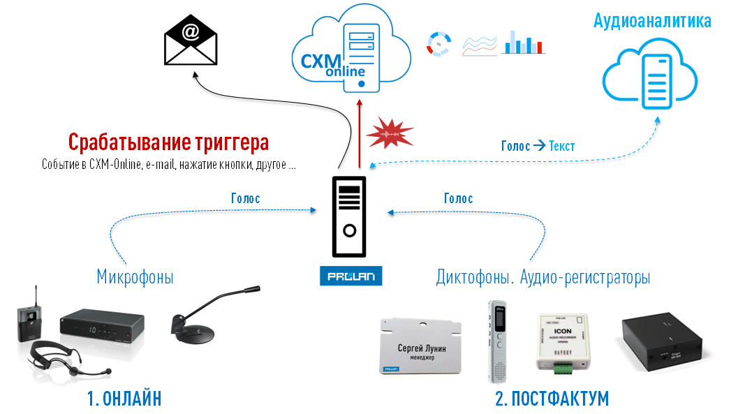 Аппаратные аудио-регистраторы. Устройство автоматически, в режиме 24*7 пишет речь на внутреннюю память (microSD-карту). Специальная программа ПРОЛАН, выполняемая на Windows-компьютере, с определенной периодичностью (например, раз час) по сети подключается к аудиорегистратору, "вырезает" из аудио-регистратора нужные звуковые треки, которые с помощью определенной системы речевой аналитики транскрибирует, и полученный текст анализирует на наличие определенных слов и выражений (определяет голосовые события). Получаемая информация, включая голосовые события, звуковые треки и соответствующий транскрибированный текст автоматически передается в CXM-Online.